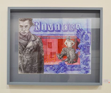 Ακουαρέλα σε χαρτί με μπλε πασπαρτού και ίδιο χρώμα κορνίζα (κουτί). Το τζάμι τοποθετημένο σε απόσταση ώστε να δίνεται η αίσθηση του βάθους!