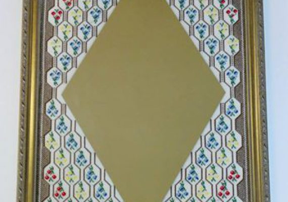 Παλαιό κέντημα με καθρέπτη σε σχήμα ρόμβου. Μοναδική κατασκευή! Γιατί; Δεν είναι καθρέπτης σε σχήμα ρόμβου… Δίνουμε εμείς το σχήμα που θέλουμε στον καθρέπτη ενώ το κρύσταλλό μας παραμένει εννιαίο! Βγάζουμε την επαργύρωση στην επιφάνεια που θέλουμε να φαίνεται το φόντο μας (κέντημα) και ο καθρέπτης παραμένει σε ό,τι σχήμα επιθυμούμε!!